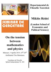 Miercuri, 3 aprilie, în cadrul Seminarului de cercetare al Departamentului de Filosofie Teoretică, Prof. Miklós Rédei, de la London School of Economics and Political Science va susţine prezentarea intitulată „On the tension between mathematics and physics”.