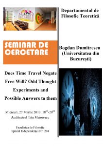 Miercuri, 27 martie, în cadrul Seminarului de cercetare al Departamentului de Filosofie Teoretică, Bogdan Dumitrescu va susţine prezentarea intitulată „Does Time Travel Negate Free Will? Odd Thought Experiments and Possible Answers to them”.