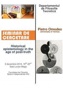 Joi, 6 decembrie, în cadrul Seminarului de cercetare al Departamentului de Filosofie Teoretică, domnul Pietro Omodeo, de la Universitatea din Veneţia, va susţine prezentarea intitulată „Historical epistemology in the age of post-truth”.