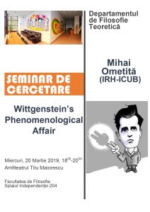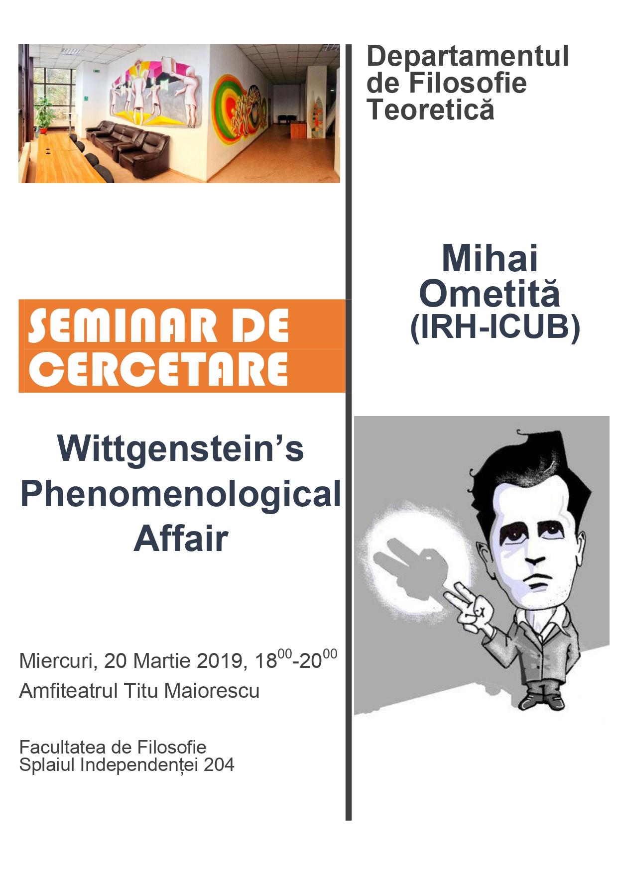 Miercuri, 20 martie, în cadrul Seminarului de cercetare al Departamentului de Filosofie Teoretică, Dr. Mihai Ometiță (IRH-ICUB) va susţine prezentarea intitulată „Wittgenstein’s Phenomenological Affair”.