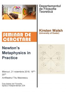 Miercuri, 21 noiembrie, în cadrul Seminarului de cercetare al Departamentului de Filosofie Teoretică, Dr. Kirsten Walsh (University of Exeter) va susţine prelegerea „Newton’s Metaphysics in Practice”.