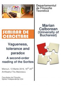 Miercuri, 13 martie, în cadrul Seminarului de cercetare al Departamentului de Filosofie Teoretică, Marian Călborean va susţine prezentarea intitulată „Vagueness, tolerance and paradox. A second-order reading of the Sorites”.
