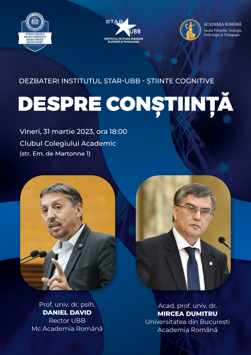 Academicianul Mircea Dumitru – filosof, profesor univ. dr. și fost rector al Universității din București, vicepreședintele Academiei Române – și prof. univ. dr. Daniel David – psiholog, profesor și rector al Universității Babeș-Bolyai din Cluj-Napoca (UBB), membru corespondent al Academiei Române și președintele Asociației Psihologilor din România – au dezbătut tema conștiinței, în cadrul seriei de conferințe ale Institutului STAR-UBB, în contextul științelor cognitive.